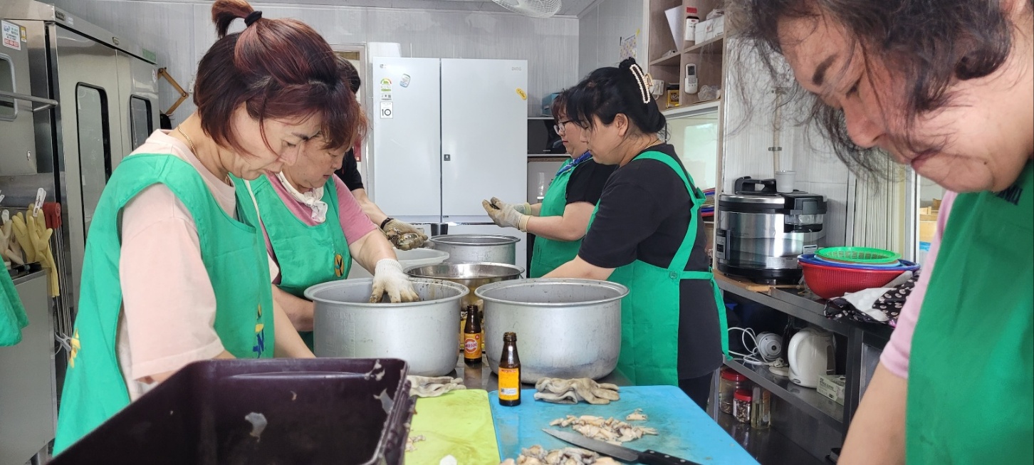 법 1동 새마을 부녀회에서 7/4~7/5 까지 전복죽 나눔 행사를 했습니다. 4일날 전복과 나머지 야채 들을 손질해 놓고 5일 죽을 만들어 법 1동에 있는 각 경로당에 전달했습니다. 더운 날씨에 모두 모여서 기분이 좋았고 즐거운 마음으로 진행했습니다.